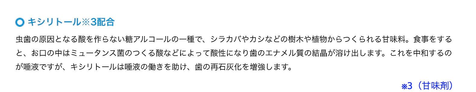 ソルビトール、グリセリン、ピロリン酸 2Ca、水、含水シリカ、キシリトール、イソセテス-20、セルロースガム、クエン酸 Na、香料、マカデミア種子油、EDTA-2Na、ポリリシン、ナイシン、ラクトフェリン、アロエベラ液汁、乳酸 Ca